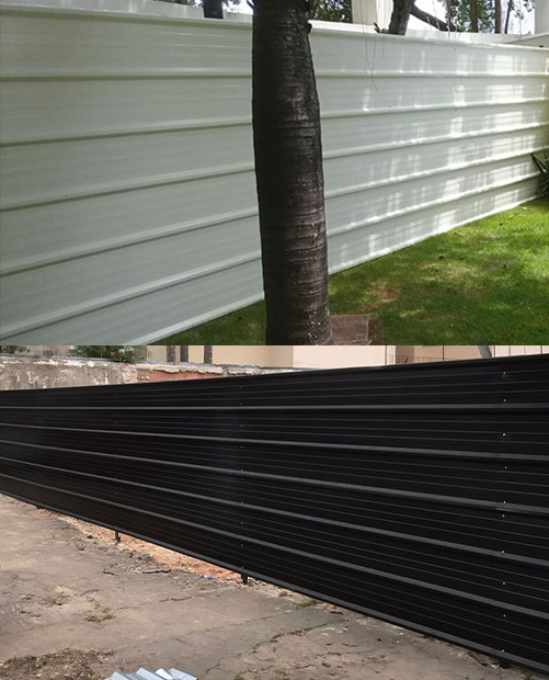 Os tapumes metálicos são fabricados em aço galvanizado, garantindo durabilidade, resistência a intempéries e rápida instalação, sendo ideais para projetos comerciais, industriais e residenciais.